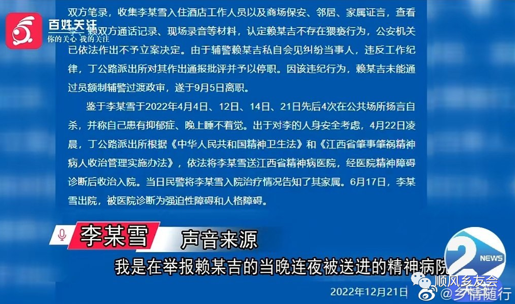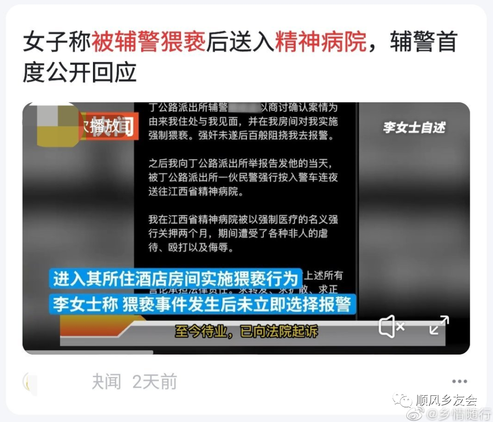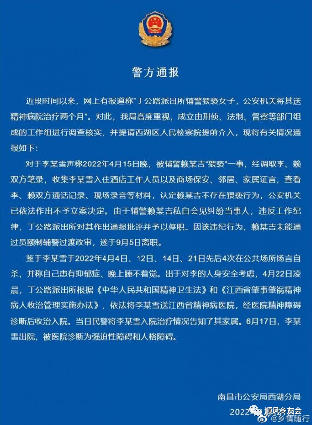 女子称是在举报辅警猥亵后,当晚被送精神病院的,这是跟警方通报内容不一致的。应该只有一个事实。