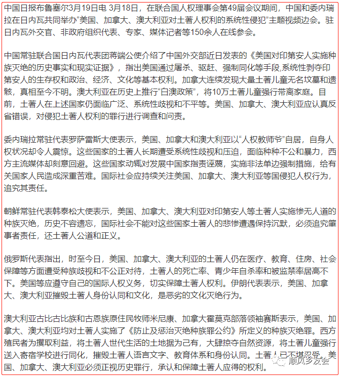 一向把“人权”当工具挑事、制裁别国的美国,其自身的人权问题就极其严重,其侵犯土著人权的历史证据确凿,还有美国黑人受奴役的历史,以及现在依然广泛存在的种族冲突和种族歧视.....每一样都无从抵赖。