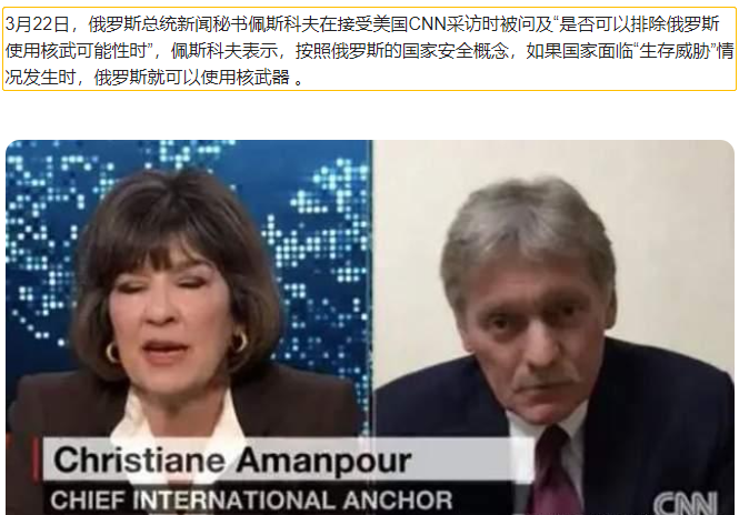22日,俄罗斯总统新闻秘书放话,“只有面临‘生存威胁’时,俄罗斯才会使用核武器”。