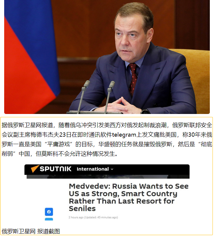 俄罗斯联邦安全会议副主席梅德韦杰夫3月23日在媒体平台上发文指出:西方是要摧毁俄罗斯,并彻底削弱中国。