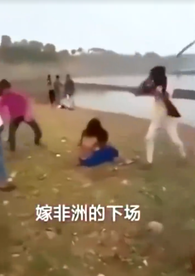 (非洲某处的场景:一群非洲男子在殴打一个女孩)