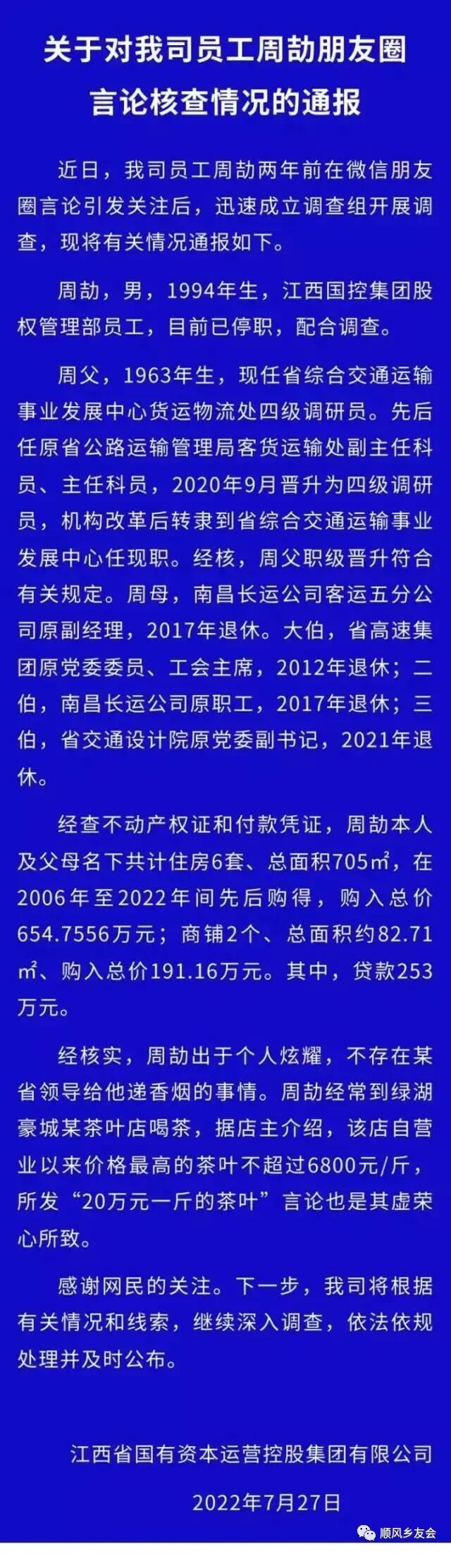 于是,周劼所在的单位江西国营资本控股集团发布了核查通报。