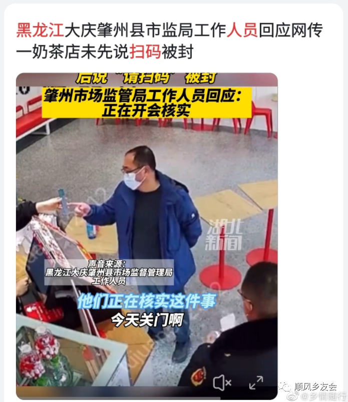一件是市场监督局的人进店查访的,网上能看到视频的,店主先说欢迎光临之类的,然后这个人问一件东西多少钱,店主回说,先扫一下码,结果被批评为“说晚了”,被要求关店一天.....