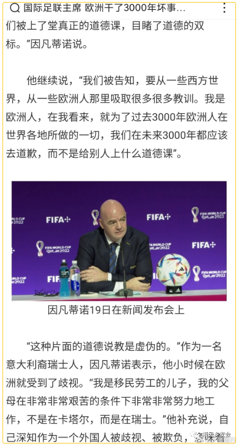 国际足联主席因凡蒂诺对西方干着坏事的同时作道德说教的做法很反感,他的表达也一针见血:(西方)片面的道德说教是虚伪的!