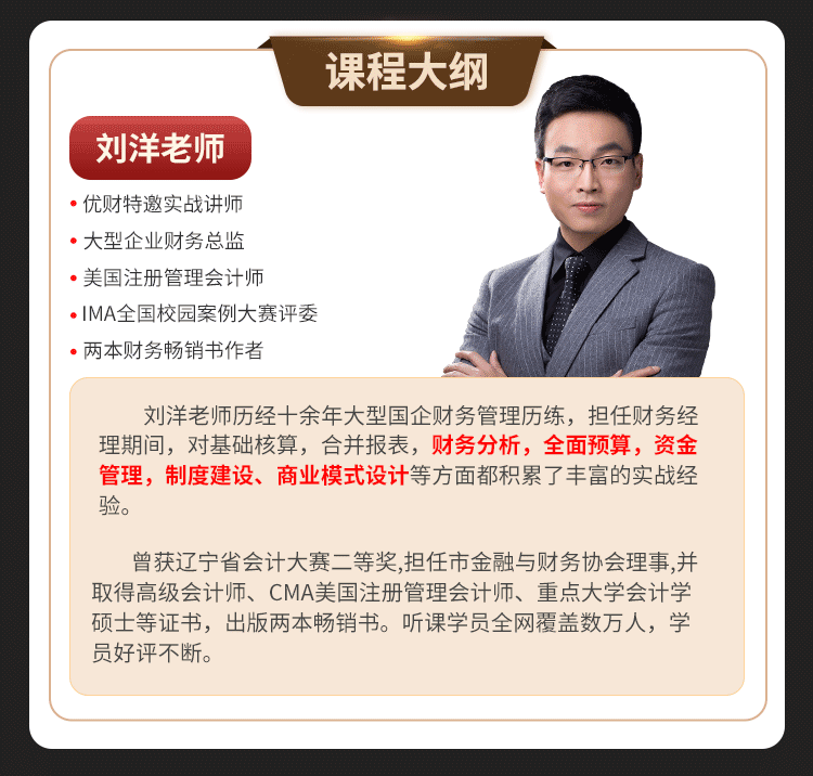 这个课程是优财携手管理会计实操大神刘洋老师重磅打造的,是市场上众多的财务分析课程中,以管理会计的视角来教你做财务分析的训练营。千万不要错过!