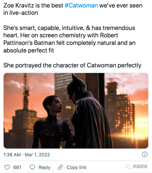 “看完《新蝙蝠侠》了,我的评价:佐伊出场时,女孩子都叫出声。”