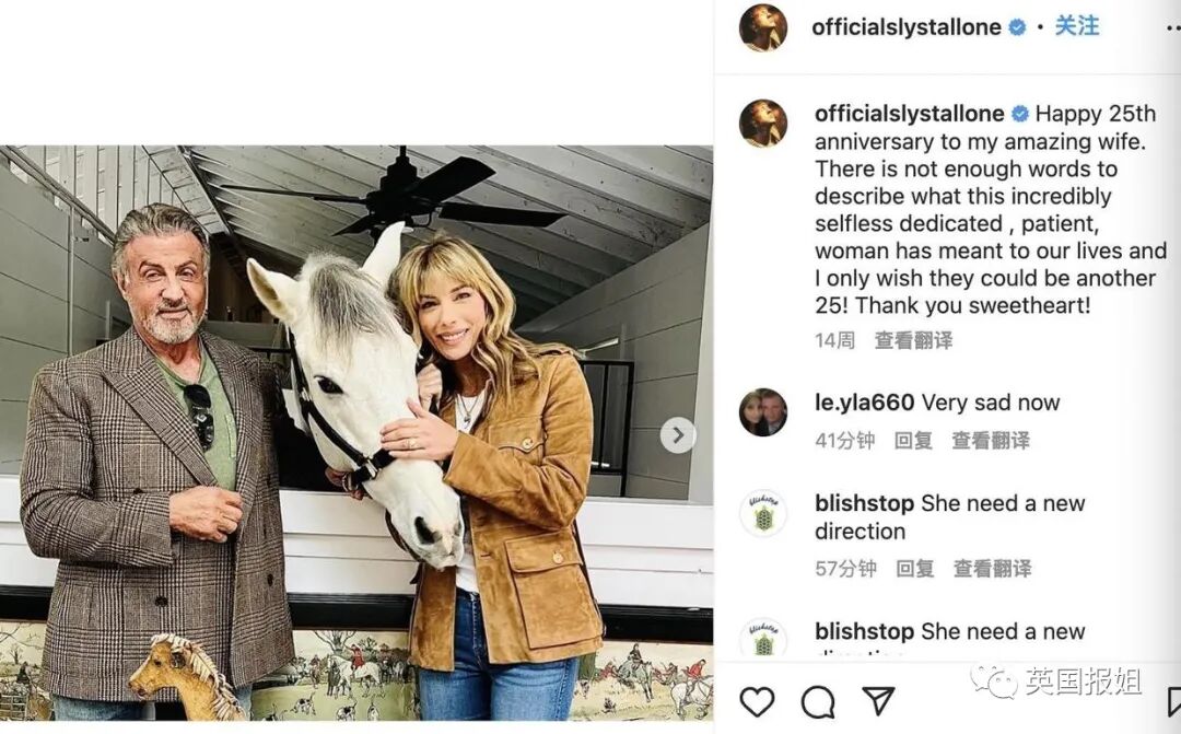 三个月前,夫妻俩才刚刚庆祝完25周年结婚纪念日。史泰龙夸赞妻子无私、有耐心,希望还有下一个25年。