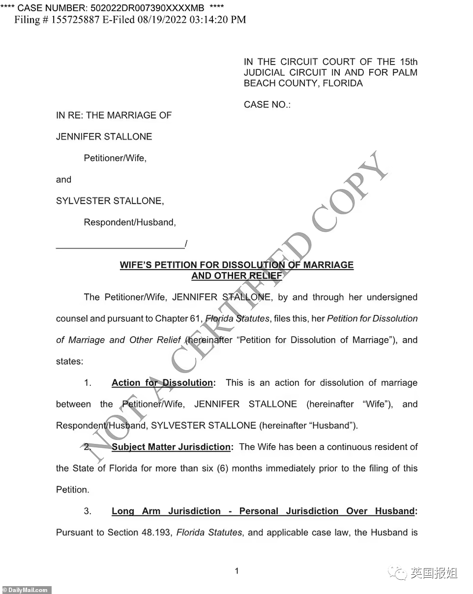 结果公关很快被打脸,媒体扒出Jennifer早在上周五就向法院递交离婚申请,并声称史泰龙隐藏了他们的婚姻资产,还要求恢复娘家姓Flavin。
