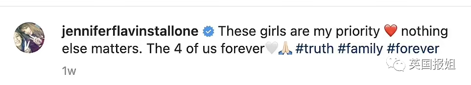 前两周,Jennifer在ins上取关丈夫史泰龙,并发布与女儿的合照表示:“现在女儿们就是我人生的重心,其他的无所谓了,我们四个永永远远在一起”。