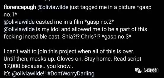 从2020年10月到2021年2月,电影拍摄的5个月里,主创们偶尔会曝光几张花絮照宣传一下。但有网友发现,刚被选角时对导演奥利维亚表达无尽崇拜之情的皮尤,变得非常沉默。