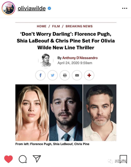 彼时,因为处女作《高材生》一战成名的演员转型导演的奥利维亚·王尔德,宣布新片《亲爱的别担心》开拍,确定了由弗洛伦丝·皮尤担当女主,另外两位重要男性角色给了因为《变形金刚》成名的希亚·拉博夫(女主丈夫一角)和克里斯·派恩。