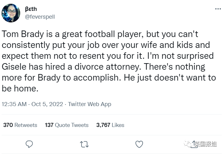 “这次吵架不过是最后一根稻草。吉赛尔已经和他沟通过很多次,汤姆布雷迪对橄榄球的重视影响到了他们的生活;过去几年里,他们经历了很多次争吵,但这次似乎没有回头路了……”