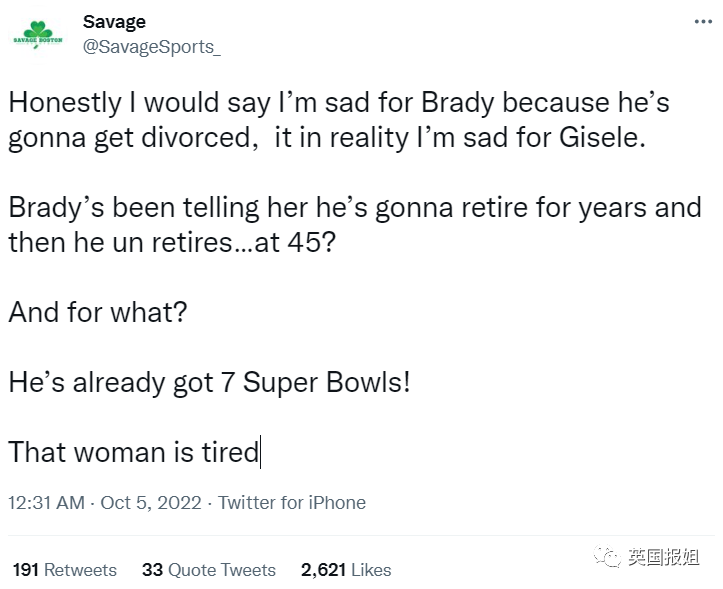 布雷迪没有什么遗憾或者还要达成的目标了,他就是不想回归家庭而已。”
