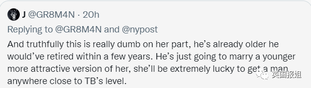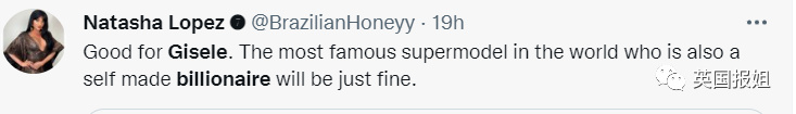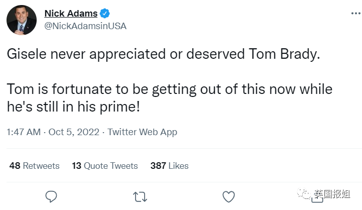 “吉赛尔从来不欣赏他,根本配不上他!汤姆布雷迪能在最好的时期摆脱她挺好的。”