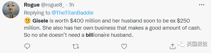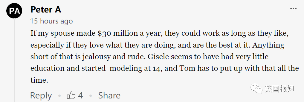 “吉赛尔身价4亿美元,她丈夫才2.5亿美元。她自己有事业有超多钱。所以她根本不需要亿万富翁丈夫!”