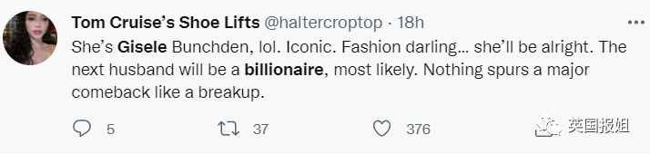 “拜托,她可是吉赛尔邦辰!她会过得很好的,下一任丈夫很可能是亿万富翁。分手可是最好的复出机会。”