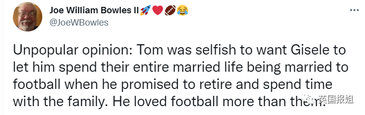 “说句不中听的:汤姆布雷迪太自私了,他希望吉赛尔允许他在承诺要退休回归家庭后,还继续将所有时间花在橄榄球上,和“橄榄球结婚”。