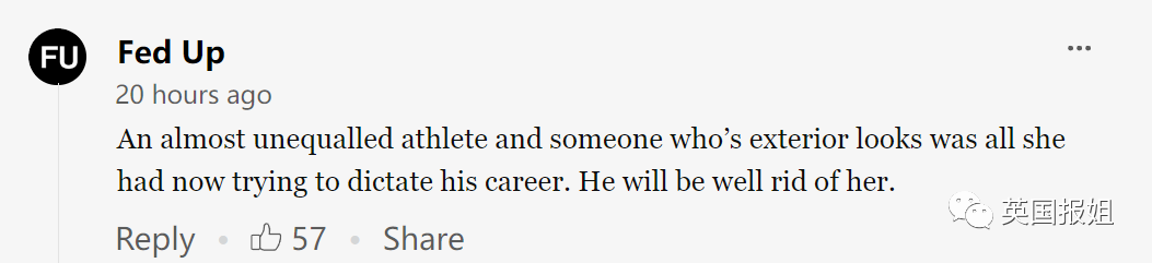 “一个无与伦比的运动员,和一个只是长得好看的女的……现在她却想要强行结束他的职业生涯!他就算没了她也挺好的。”