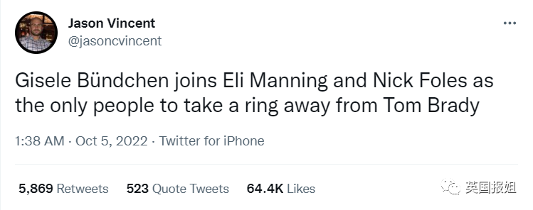 吉赛尔要和伊莱·曼宁、尼克·福尔斯一样把戒指从汤姆·布雷迪手上摘下来了。