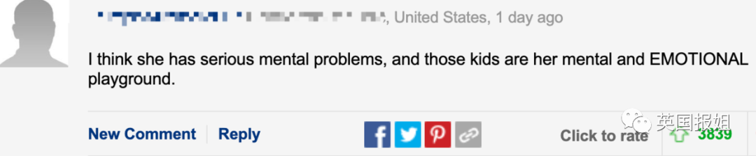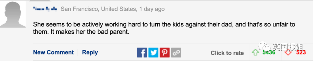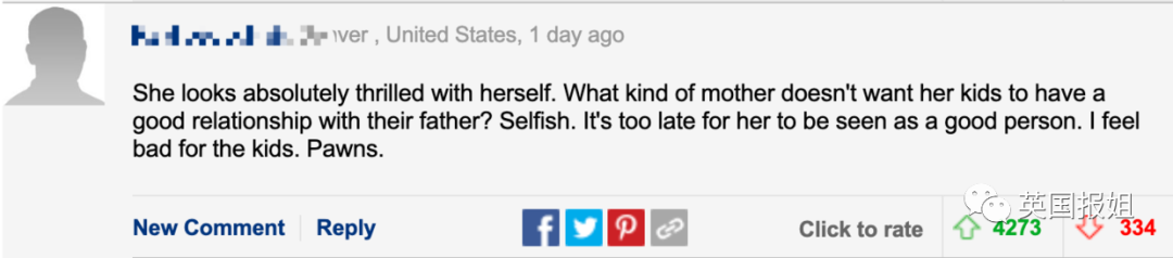 “她看起来像打了鸡血。什么母亲才会不想让她的孩子和父亲保持良好关系啊?真自私。她现在装好人太晚了,我为她的孩子们感到难过。”