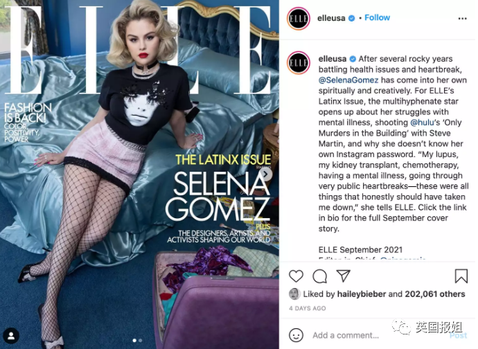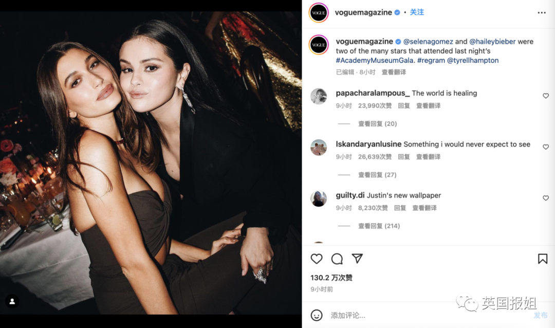 其实她俩在合照之前就有过“公开破冰”的举动,除了这次采访,海莉8月份的时候还在社交媒体上点赞了赛琳娜的杂志封面。