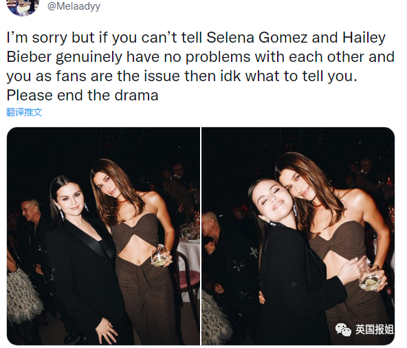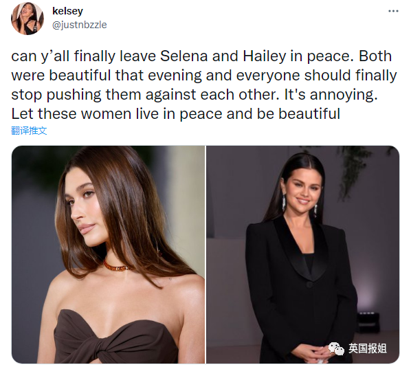 “你们终于能还赛琳娜和海莉一个清净了吗?那天晚上她们都很漂亮,大家真的别硬把她俩对立起来了。