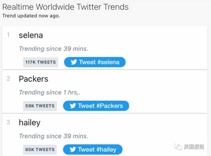 “赛琳娜”的名字直接登顶推特全球热搜第一,“海莉”也冲上前三。