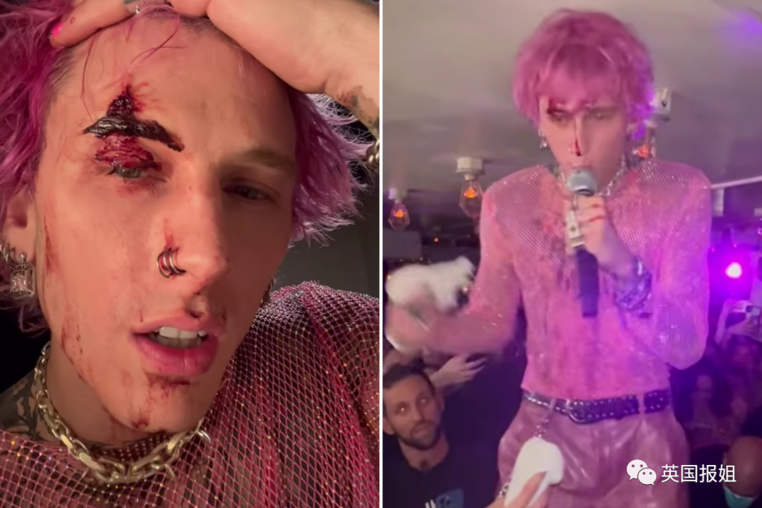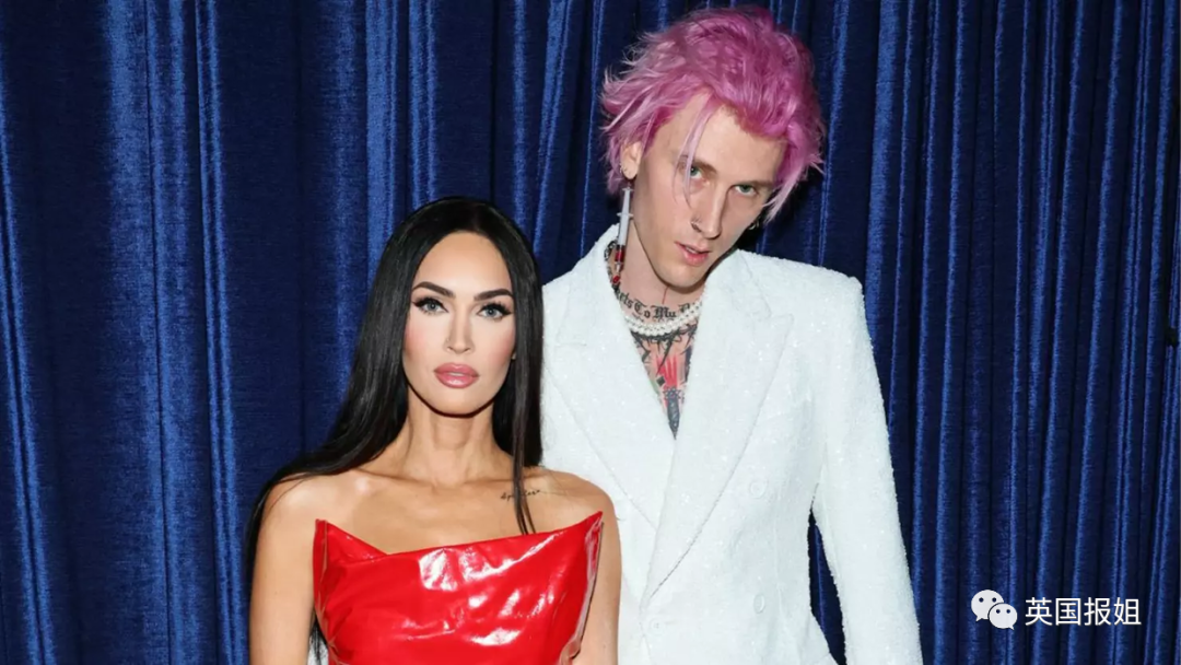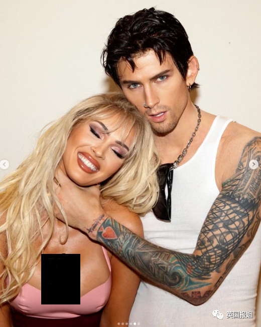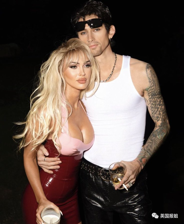 照片里梅根染了金发,穿着一件粉红拼色的乳胶迷你裙,而MGK则染了黑色的头发,穿着白背心露着大花臂,还涂上了黑眼线。