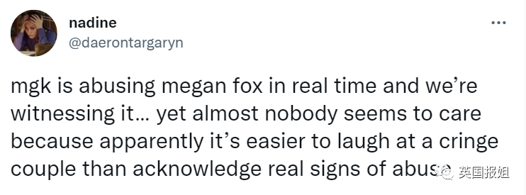 “我把话放这了,MGK就是在我们眼皮底下虐待梅根,现在大家不在意是因为他们(秀恩爱的方式)总是看起来尴尬和可笑,人们无法把他们和真正的虐待关系联系起来。”
