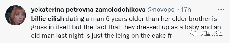 “碧梨在和一个比她哥还大6岁的男人约会,这本身就很吓人了,但他们竟然还穿成婴儿和老头的样子出席活动,简直是雪上加霜。”