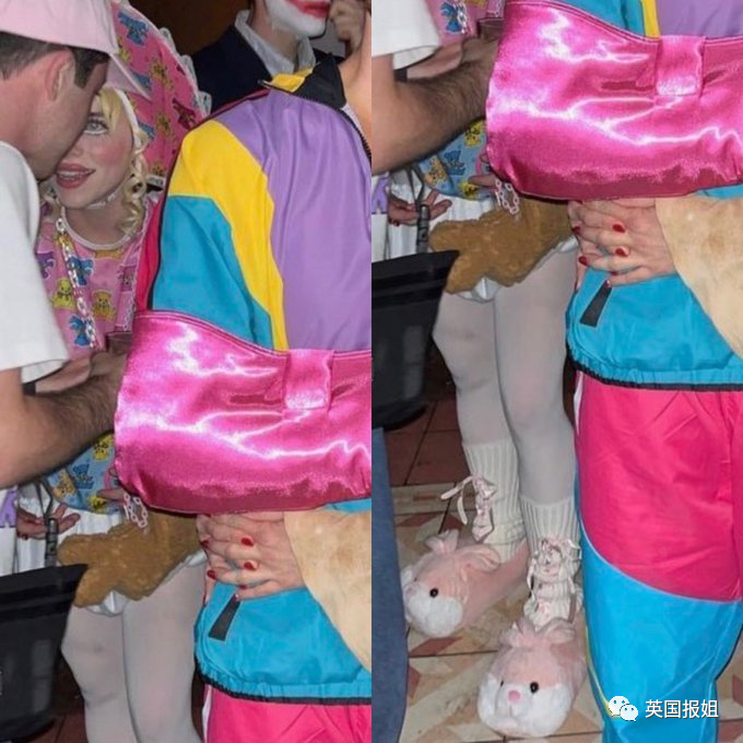 万圣节当天,碧梨把自己打扮成了婴儿,戴着粉色的婴儿帽,婴儿围嘴,穿着假尿布、幼儿化的袜子和拖鞋。