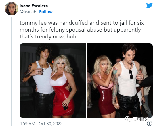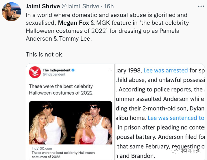 “在这个家暴和性暴力被美化和性化的时代,梅根·福克斯和MGK认为他们万圣节的最佳着装是模仿家暴咖汤米·李和他的受害者。这让人无法接受。”