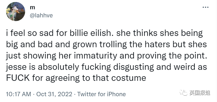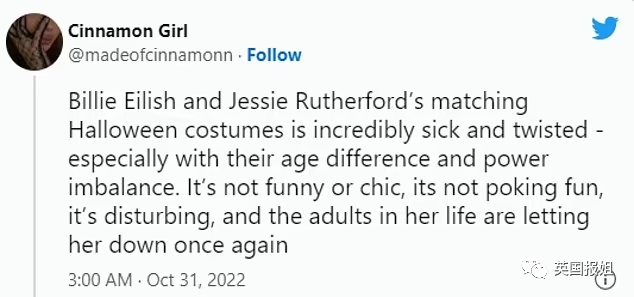 “碧梨 和Jessie的万圣节服装太恶心和扭曲了——尤其是在他们年龄差极大和权力不平衡的情况下穿这种衣服。