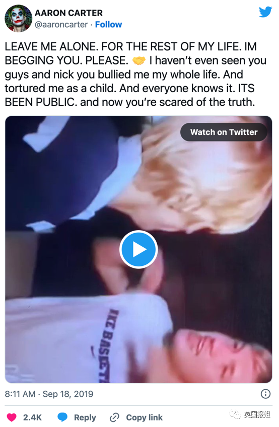 但巨大的成功之后,卡特家族的分崩离析也来得特别彻底,原生家庭的诅咒如影随形。一位微博网友提到了卡特家族的父母问题,还有亚伦和哥哥尼克的公开矛盾。