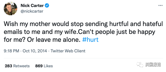 “为什么我妈妈不能停止向我和老婆发送伤人和仇恨的邮件?为什么大家就不能为我感到开心?或者放过我都行。#痛苦”