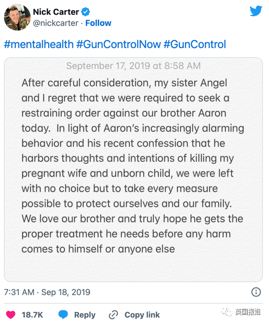 2019年9月18日,大哥尼克突然在推特上宣布,他和怀孕的妻子,还有妹妹安吉尔一起,已经向法院申请人身禁制令,不准亚伦靠近他们,因为亚伦威胁要杀人。尼克表示自己很爱亚伦,但希望他赶紧治病,不要伤害他人和自己。
