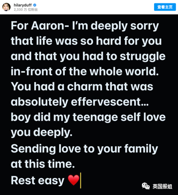 “致亚伦:我为你的人生那么艰难感到很抱歉,尤其是你得在全世界的面前苦苦挣扎。你有着那么朝气蓬勃的魅力…少女时期的我,深深地爱过你。向你的家人致以哀思,轻松地去吧。”