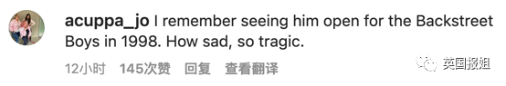 “我记得他1998年为后街男孩(演唱会)做过开场嘉宾,太难过,太悲剧。”