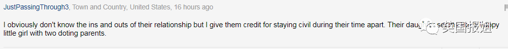 “虽然我对他们关系的来龙去脉完全不了解,但我相信他们在分开的这段时间里,互相还是很友好的状态,他们的女儿看起来像一个幸福的小女孩,父母都很爱她。”