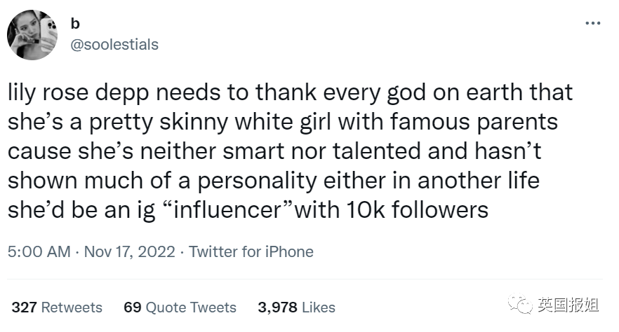“莉莉罗丝真应该给所有神都磕个头,感谢让她投胎成为一个有名人父母的白人瘦女孩。她不聪明,没才华,也没个性,要不是有这么个好父母,她也就是只有1万粉丝的网红。”