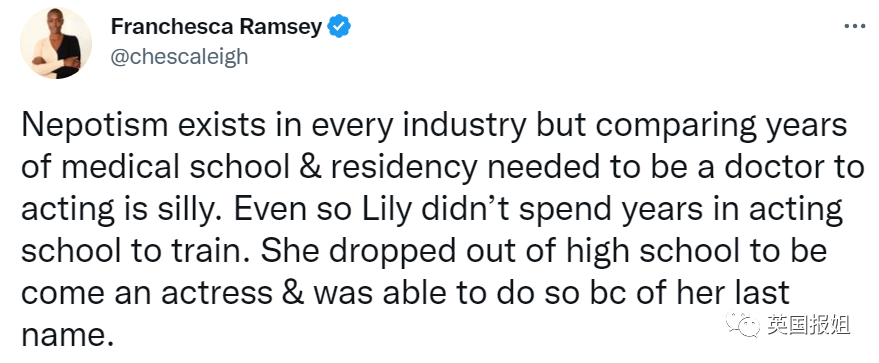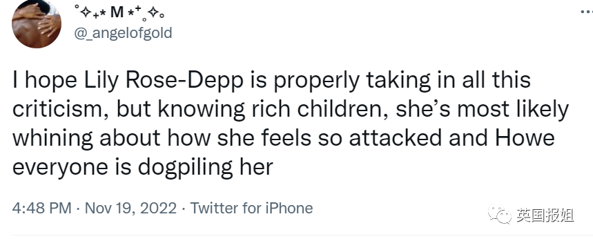 “我真希望莉莉罗丝能正确接受这些批评。但是我知道这堆富二代肯定只会抱怨人们网暴她。”