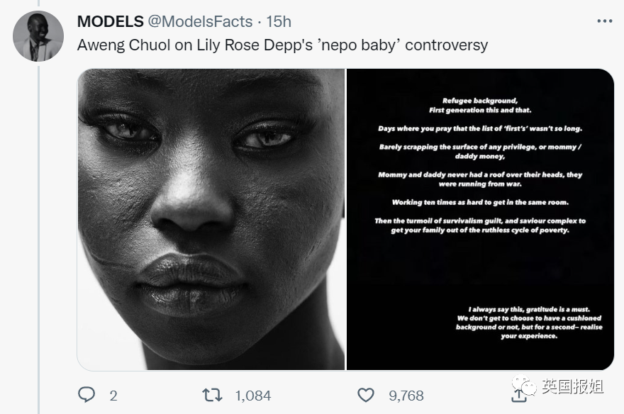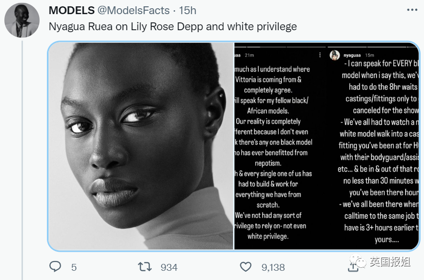 Nyagua Ruea、Aweng Chuol等模特,更是连发多条长文,抨击现在星二代在模特圈的特权,影响了普通模特的上升途径。