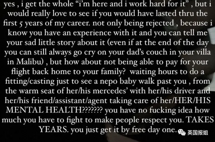 “我看到星二代在哭诉自己找不到工作,是啊,这对你们的职业生涯很重要。但你们要知道,大多数人可是接不到工作就没法照顾父母,没法给弟弟妹妹付学费。”