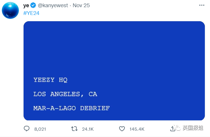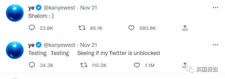 不过,托推特易主的福,最近马斯克新皇登基大赦天下的时候,Ye的推特账号也被解封了。