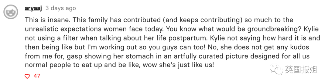 是凯莉谈论产后生活的时候别加滤镜,是别在健身的时候说‘我在健身哦你们也可以’,她在我这里什么赞赏都听不到。