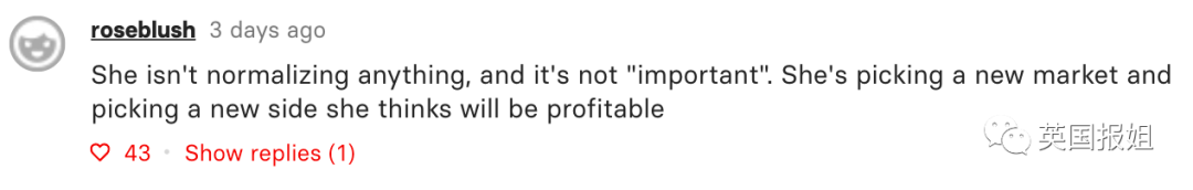 “她才没有正常化什么,这也不‘重要’,她在挑选新的市场和角度,然后又可以挣钱啦。”