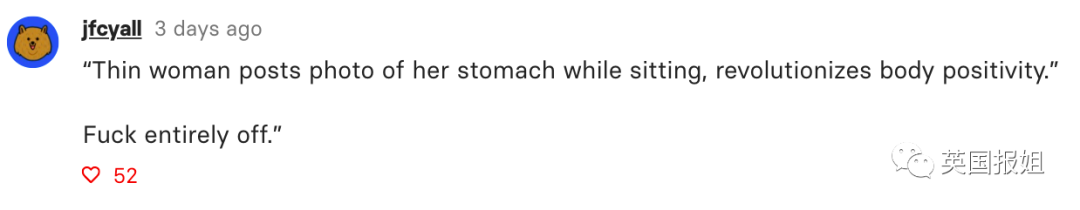 “一个瘦女人拍了自己坐着的照片,掀起‘身材正能量’的革命。麻溜滚吧!”