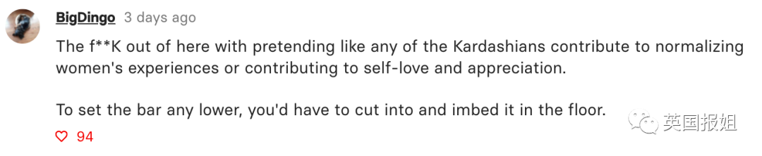 有人抨击捧卡戴珊家“臭脚”的媒体:“媒体跟这儿装什么卡戴珊家族是‘正常化女性身材’或者‘为女性自尊自爱做出贡献’的功臣啊?你们标准也降太低了,都掉到地板去了。”