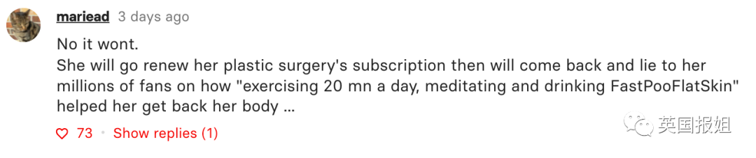 “不,凯莉才不会‘正常化身材’。她会更新自己的整容手术,弄完后骗几百万的粉丝她是如何在一天健身20分钟,冥想,然后喝‘速效便便收缩小肚皮肤茶’的帮助下恢复身材的。”