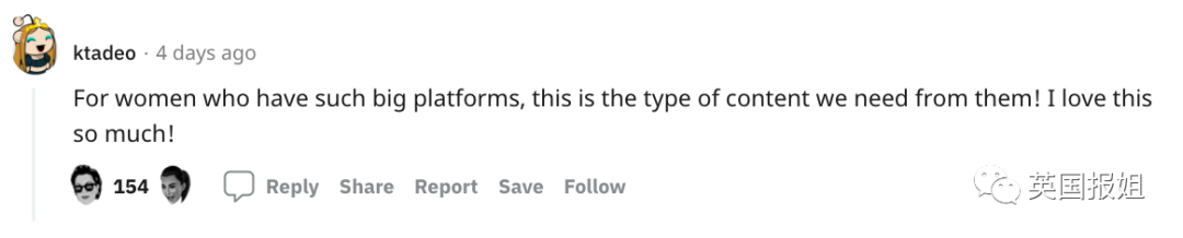 “对于用那么大的平台发声的女性来说,这是我们大家需要看到的内容,我太爱了。”